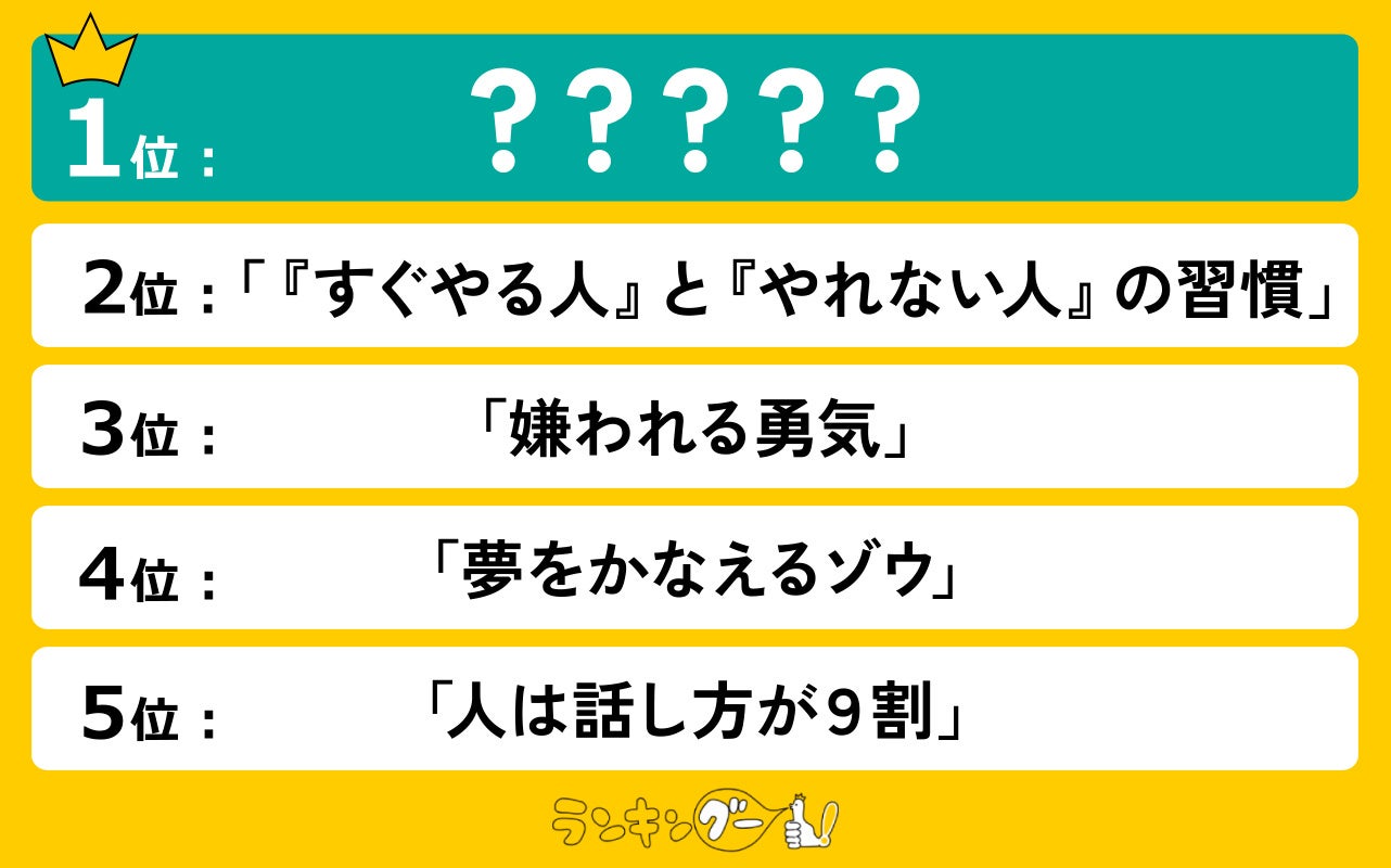 1位は、同題のジブリ映画が公開されて再注目されたロングセラー「君たちはどう生きるか」に決定!2位は、心理学に基づいた50の行動習慣を分かりやすく解説している「『すぐやる人』と『やれない人』の習慣」。3位は、世界累計部数1000万部を突破している「嫌われる勇気」。1票差で4位は、ドラマ化もされた、小説型の自己啓発本「夢をかなえるゾウ」。4票差で5位は、会話に悩みを抱える人におすすめの「人は話し方が9割」がランクインしました!