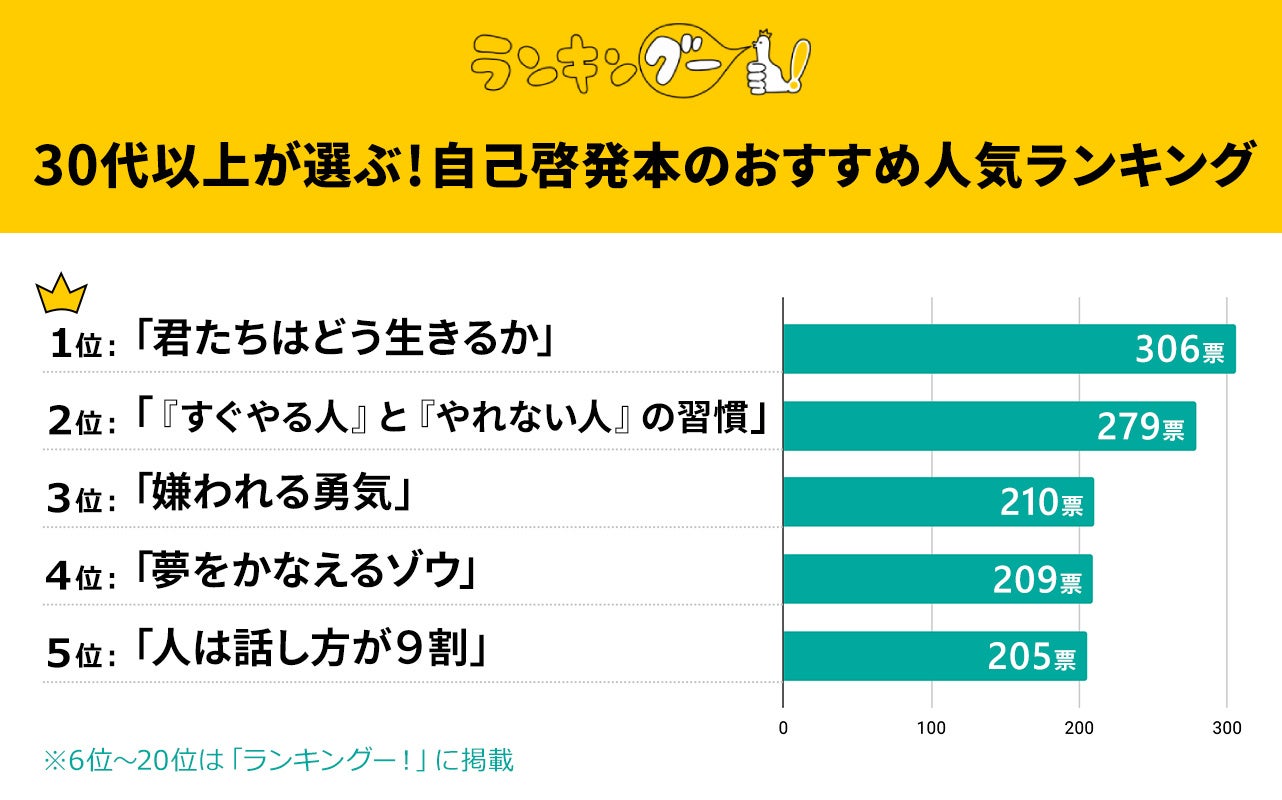 ランキングー!では30代以上が選ぶ、自己啓発本をピックアップし、ランキングを調査。30代以上の男女(性別回答しないを含む)5,923名にアンケートを行い、TOP20を決定しました。ここではTOP5をご紹介します。