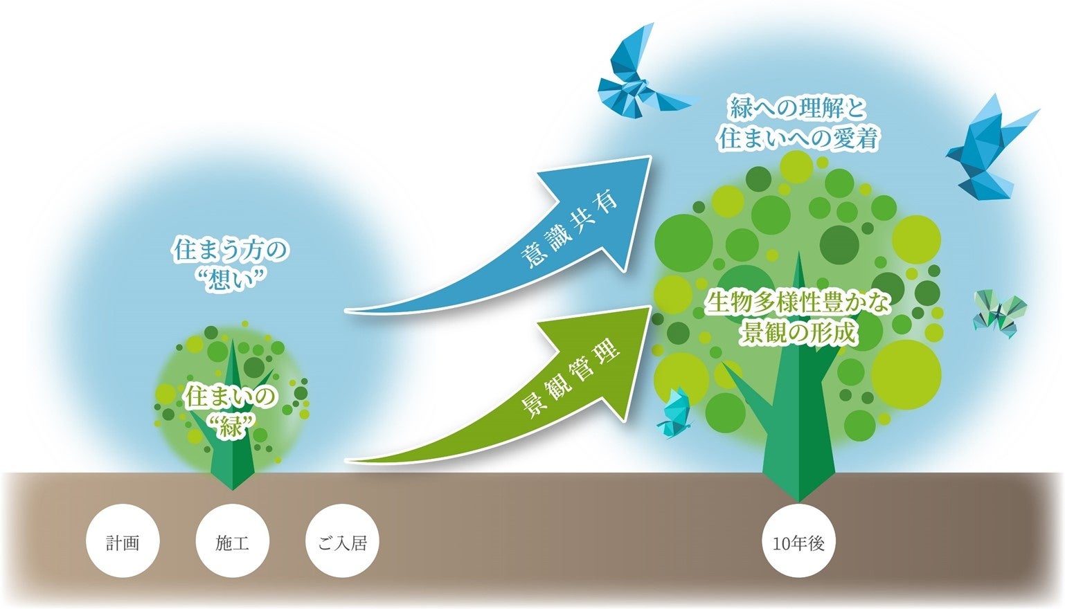 GREEN AGENDAとは、分譲マンションにおいて都市の生物多様性保全に貢献する全く新しい憬観管理計画である。生物多様性の基盤となる植栽について竣工後10年間の管理計画を策定すると同時に、生物多様性推進へのKeyとなる住民に対しても長期的に共感を育む取り組みを行い、街の人々から憧憬されるような景観を作っていく。