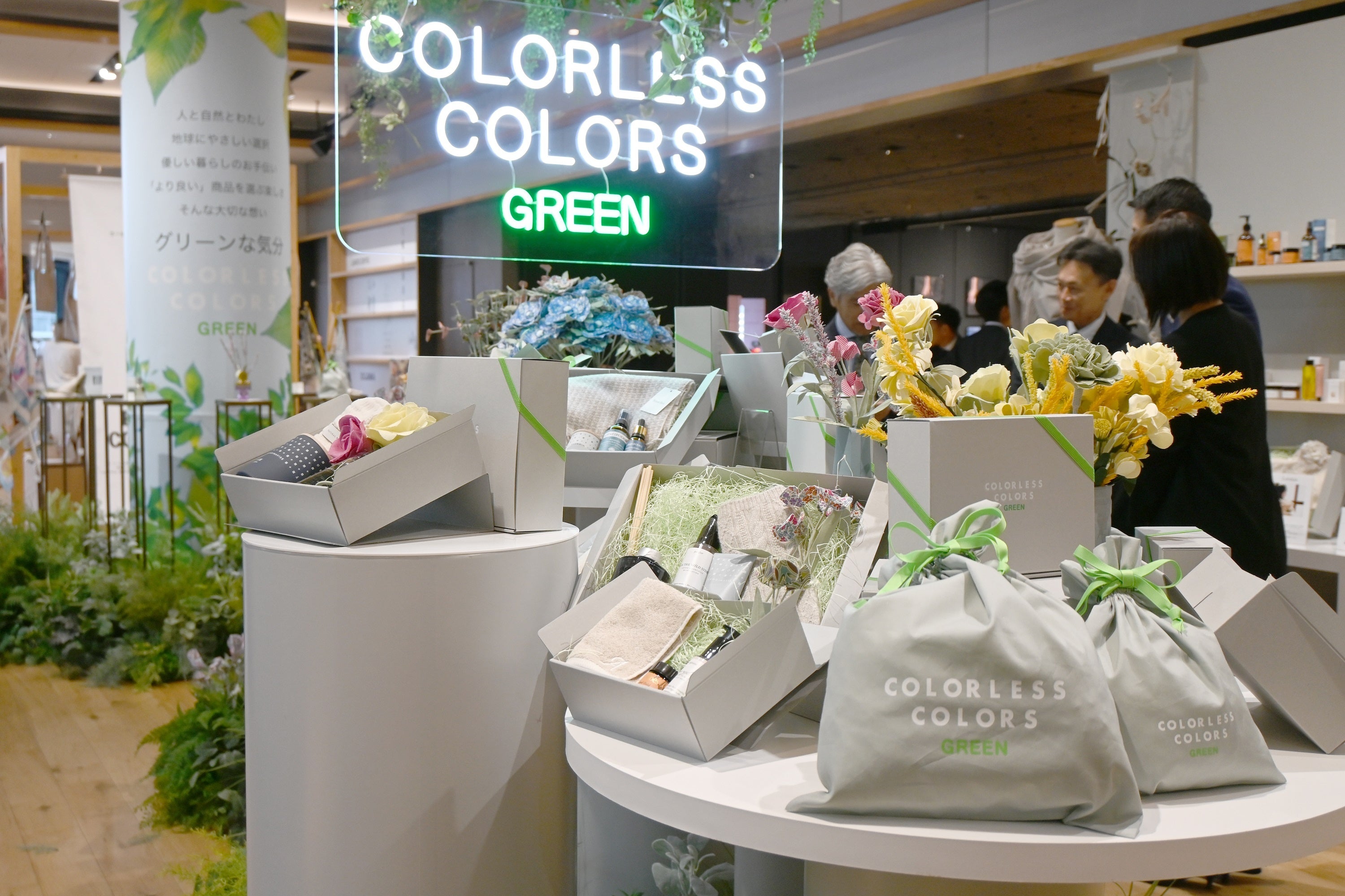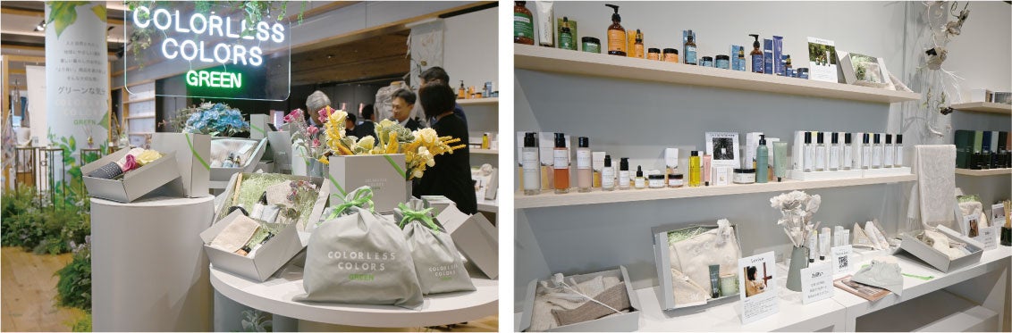 本展のエントランスでは、川辺が扱う服飾雑貨・コスメ・フレグランスのうち、サステナブルな5つのブランドを組み合わせ、一つのコンセプトショップ『カラーレスカラーズ グリーン』として演出しました。また、贈り物として購入されることを想定して、これらの商品を様々な組合せでオリジナルギフトBOXに入れ、ギフト需要を喚起する売場としてご提案しています。