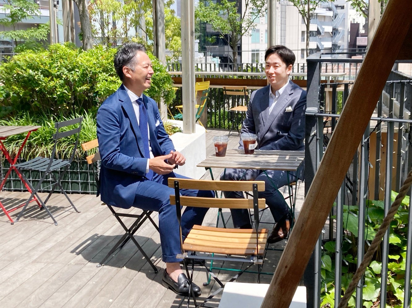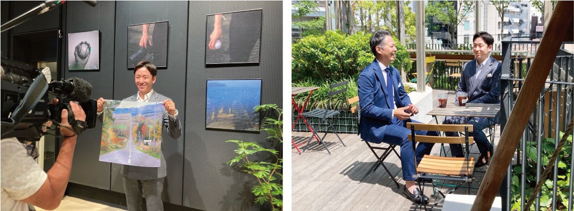 展示会初日の5/15(水)には、2023年に『斎藤ハンカチ店』*店主として川辺とのコラボレーションが大きな話題となった、斎藤佑樹さんをお招きしました。会場では、斎藤さんが趣味で撮影された写真を、川辺のグループ会社であるレインボーワールド株式会社の最新インクジェット機にてハンカチにプリントし、額装して作品として展示。ボールを握る手や、訪れた旅先の美しい風景写真など、斎藤さんご自身の経験や感性が表現された素晴らしい作品が並びました。また、開放的なテラスでは、斎藤さんと川辺代表取締役社長・岡野が、将来について和やかに語らいました。*斎藤ハンカチ店・オンラインショップ https://www.kawabe.co.jp/saito-handkerchief/