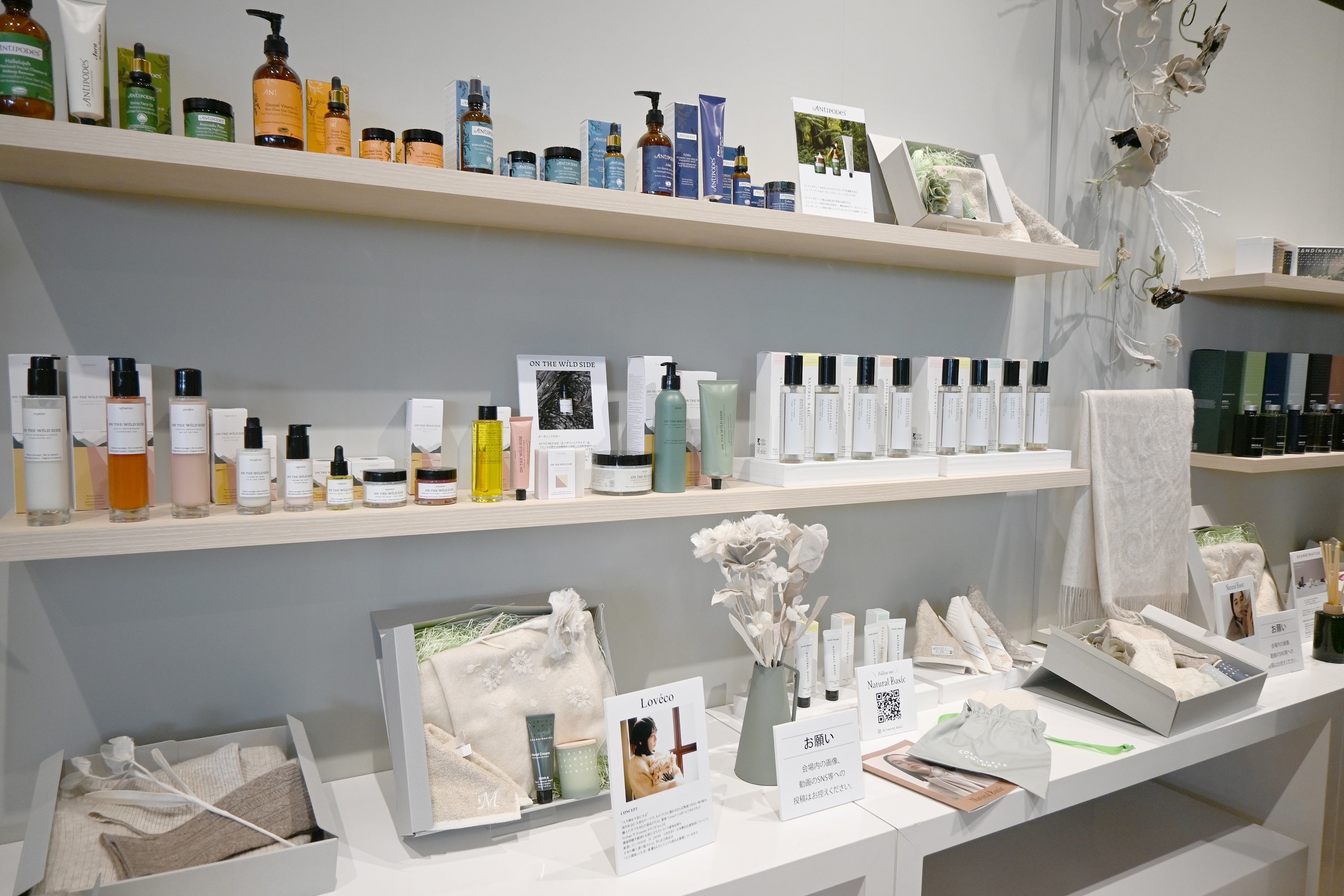 2024秋冬からは、アントニオ猪木とのライセンス契約により、ハンカチやトートバッグも登場。この他、オリジナルブランドも強化し、より広いターゲット層にアピールしていくための品揃えを充実させていきます。サステナブルなモノづくりで、マフラー、ストールやアパレルを展開するオリジナルブランド『Natural Basic』は、ロゴを一新しリブランディングに挑戦。プレミアムラインでありつつも、若年層も意識したラインナップで、今後EC展開やPR活動に注力していきます。