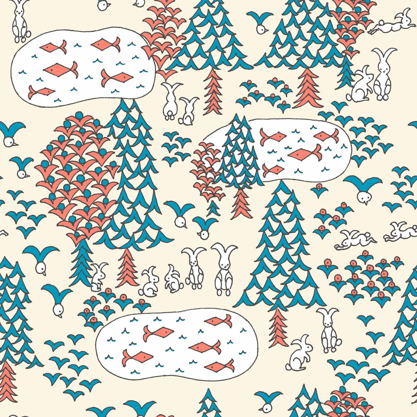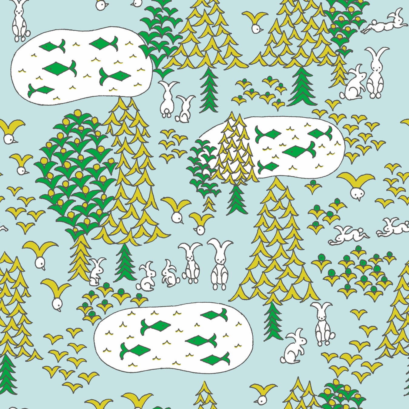 森の中に棲む生きものたち。鳥やウサギや魚、木々と草花はみんな同じ形の翼を持っています。鳥は翼に、ウサギは耳に、魚は尾ひれに、木々や草花は葉っぱとなって、翼は生きものたちの毎日を支えてくれています。この翼はみんなそれぞれの生命の中にある希望です。みんなそれぞれが持つ自分らしさを大切にして、希望とともに楽しく生活できるようにと願いを込めています。