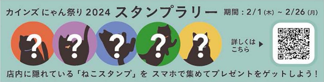 店舗に来店されるお客様も楽しめる参加型企画として、店内に隠れた5つのデジタルスタンプを探す「カインズにゃん祭り2024スタンプラリー」を開催します。キャンペーンサイトにアクセスしデジタルスタンプを全部集めると、先着で「ねこデザイン サラサボールペン」または「ねこデザイン ティッシュ」のいずれかと、「にゃん祭り2024限定 ステッカー」をプレゼント。また、2月22日(猫の日)には先着で「にゃん祭り2024限定 カチューシャ」がもらえるチャンスも。さらに、アンケートに回答していただいた方にはカインズポイントを10ポイント付与するお得で楽しい企画です。