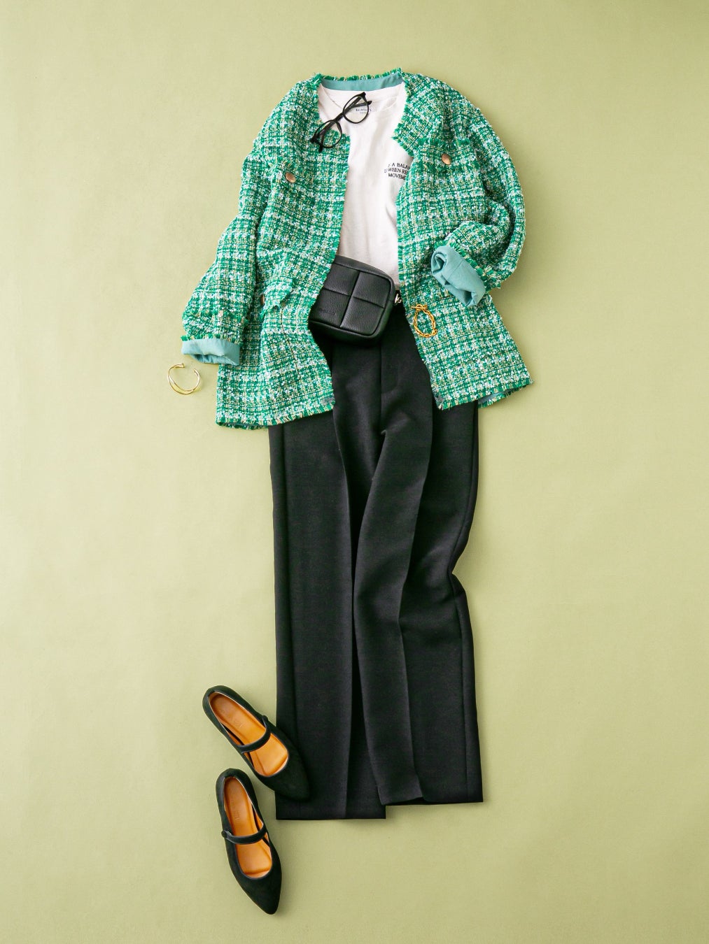 「小物やインナーのグリーンなら色浮きせず挑戦しやすい」