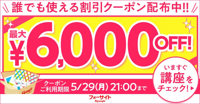 最大で6,000円割引のお得なクーポンは、5月29日(月)21時までに商品のお申し込みされた方が対象となります。