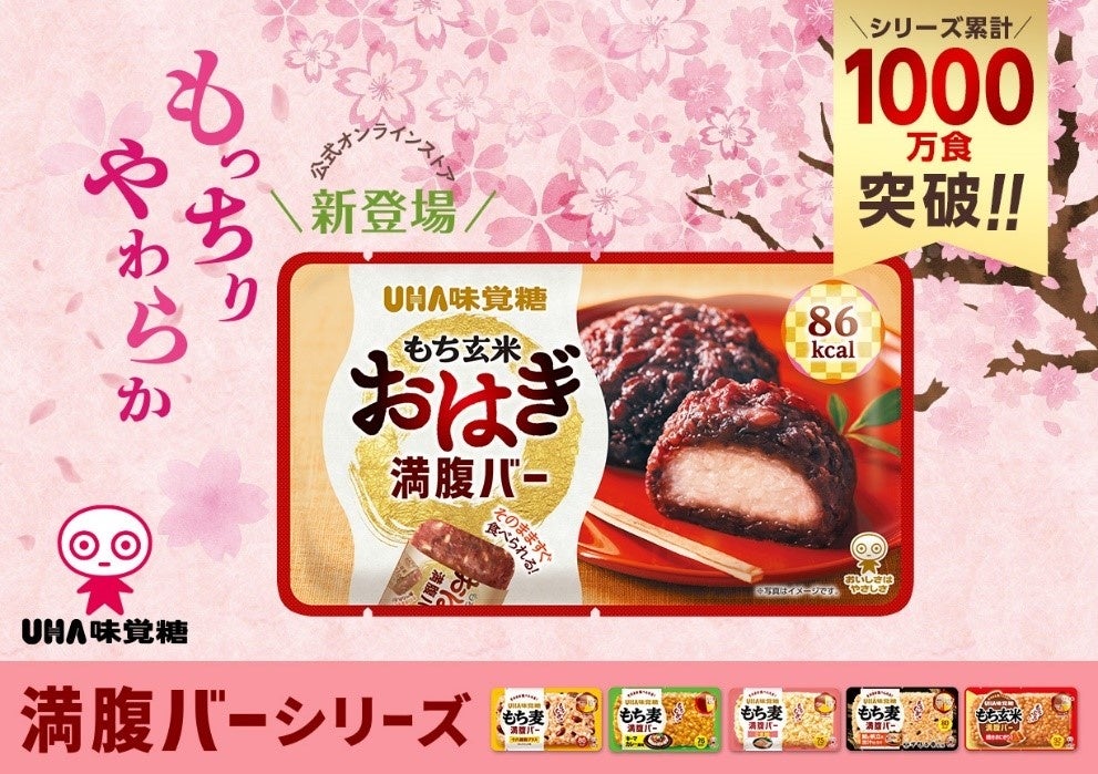 ※もち麦満腹バー[十六雑穀プラス ほんのり塩味][下鴨茶寮 鯛と帆立の出汁仕立て][ごま鮭][キーマカレー]、もち玄米満腹バー[焼きおにぎり風味][おはぎ]