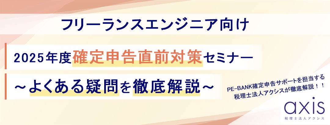 株式会社MCEAホールディングス(東京都港区/代表取締役社長 齋藤 武育)のグループ会社で、 ITエンジニアの新しい働き方を提案する株式会社PE-BANK(東京都港区/代表取締役社長 髙田 幹也)は、2026年1月8日(木)19時より、ウェビナー『 2025年度確定申告直前対策セミナー ~よくある疑問を徹底解説~ 』を開催します。本セミナーは、株式会社PE-BANKが運営するITフリーランス向け福利厚生サービス「サポートプラス」が主催しており、今回で71回目の開催となります。今回は、オンライン形式での開催となります。