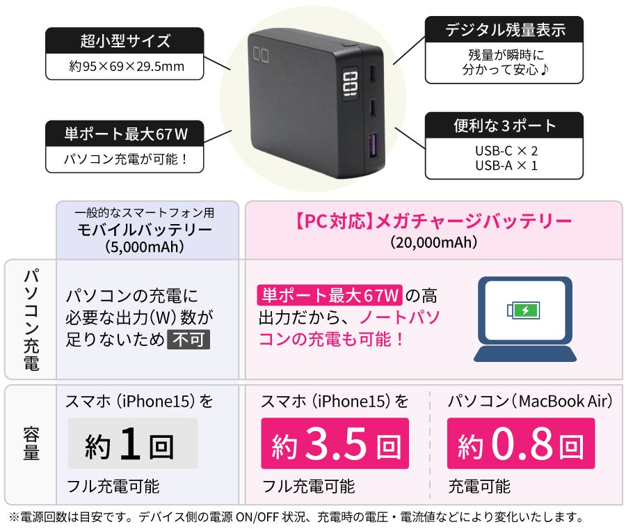 ※1)電源回数は目安です。デバイス側の電源ON/OFF状況、充電時の電圧・電流値など、使用環境により変化いたします。(検証機:iPhone15による実測)