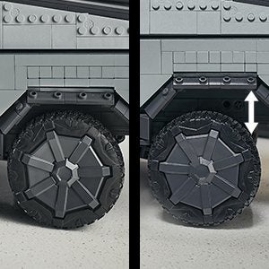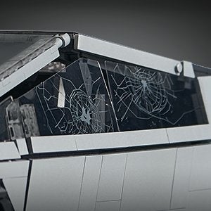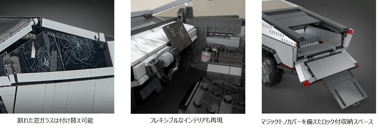 2019年、TESLA「サイバートラック」のアンヴェールイベントをロサンゼルスの会場で開催。窓ガラスの耐久性の高さを証明する実演では、鉄のハンマーでドアを思い切り叩き、金属製の玉を投げつけたところ、割れる予定ではなかった窓ガラスにヒビが入るというまさかの事態に。その結果、損傷した車の前で残りのプレゼンテーションを続けるという、思わぬ展開で話題となりました。その際の“ハンマー”や“割れた窓ガラス”も今回の「メガ テスラ サイバートラック」では忠実に再現されており、窓ガラスは付け替えてお楽しみいただけます。また、フレキシブルな内装やサスペンションの上げ下げ等、細部まで再現されています。