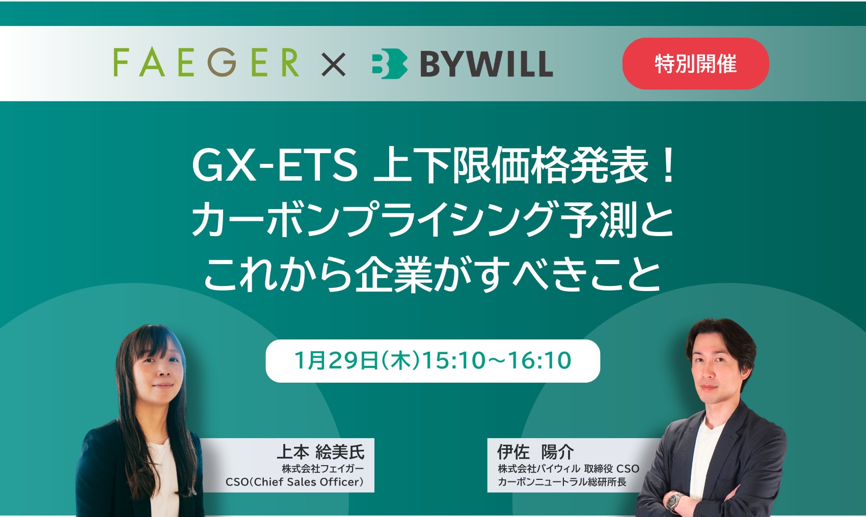 「GXをやりたくなる世界」を目指し、環境価値を活用した経済循環を推進する株式会社バイウィル(本社:東京都中央区、代表取締役社長:下村 雄一郎、以下「バイウィル」)は、農業由来カーボンクレジット開発を手掛ける株式会社フェイガー(本社:東京都千代田区、代表取締役:石崎 貴紘、以下「フェイガー」)と共催で、無料オンラインセミナー『GX-ETS 上下限価格発表!カーボンプライシング予測と、これから企業がすべきこと』を2026年1月29日(木)に開催いたします。
