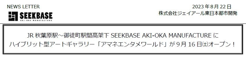 デジタルアートとフィジカルアートが展示されるハイブリッド型ギャラリー「アマネエンタメワールド」が、2023年9月16日(土)、「未知のワクワクとスグレモノを探すことができる」をコンセプトとした、JR秋葉原駅と御徒町駅間の鉄道高架下の商業施設『SEEKBASE AKI-OKA MANUFACTURE (シークベース アキオカ マニュファクチュア)』(以降、「SEEKBASE」)内に、オープンいたします。
