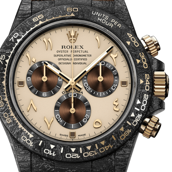 サンドカラーの文字盤、インデックスはアラビア数字で表現されています。