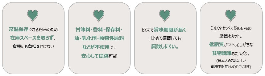 朝食ビュッフェでの牛乳代替としてグラノーラやシリアルに使用したり、客室アメニティとしてコーヒーや紅茶とセットで提供したりする展開が期待されます。ラウンジのウェルカムドリンクやカフェメニューへの活用など、インバウンドや健康志向・アレルギー対応の強化策としても広がりが見込まれます。