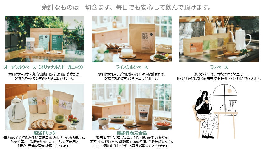 オーツ麦を原料としたOAT MILK BASE、国産米を原料としたRICE MILK BASE、ラテアレンジを楽しめるLATTE BASE、大豆をベースとした栄養補給パウダーSOY AU LAIT等を展開しています。