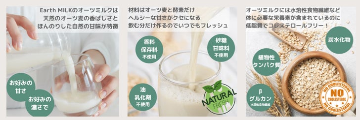 Earth MILKは、"自然の力をそのまま届ける" 「地球の恵み」をコンセプトに、オーツミルクを始めとした人にも地球にも優しい植物性ミルク製品を展開するサステナブルドリンクブランドです。