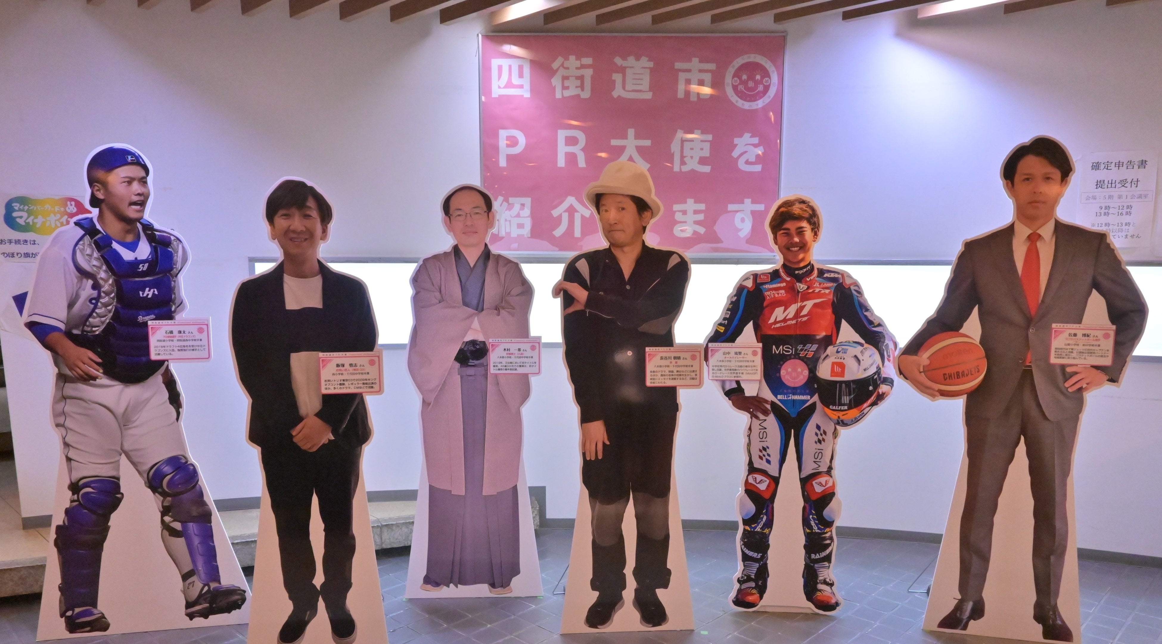 四街道市は、令和3年度に委嘱した「四街道市PR大使」6名の等身大パネルを四街道市役所正面玄関に設置します。
