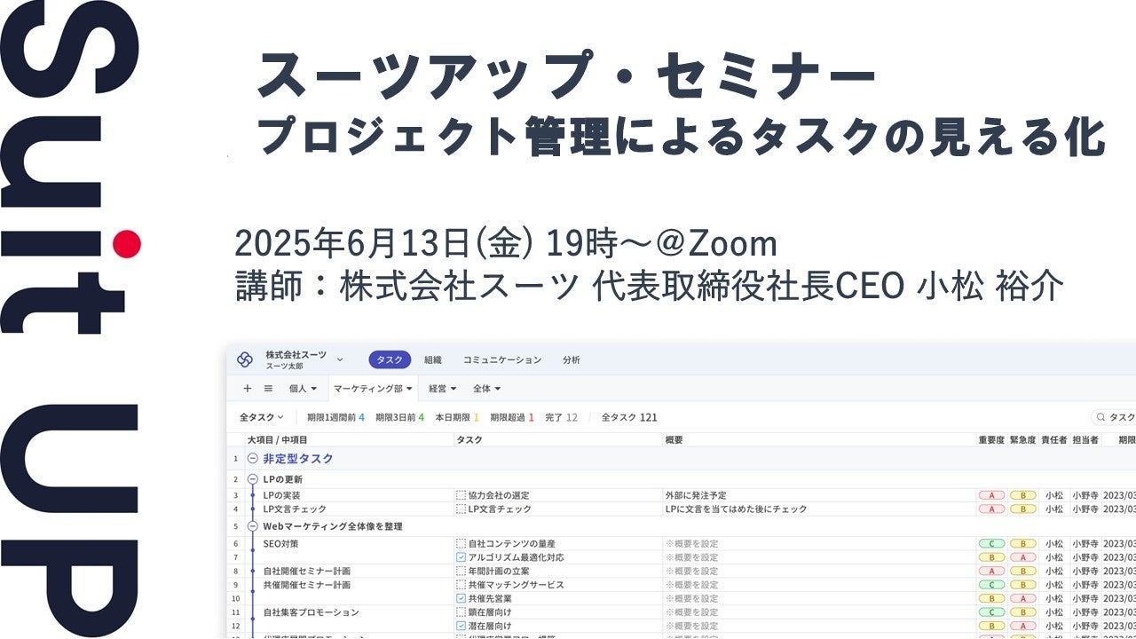 株式会社スーツ(所在地:東京都千代田区、代表取締役社長CEO:小松 裕介)は、2025年6月13日(金)19時から、当社代表の小松が講師を務めるスーツアップ・セミナー「プロジェクト管理によるタスクの見える化」を無料開催します。
