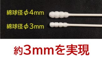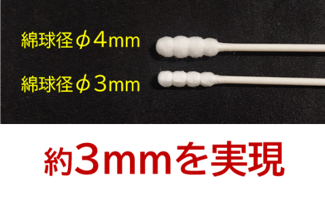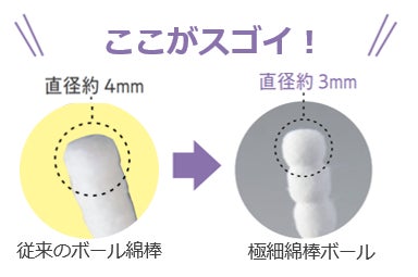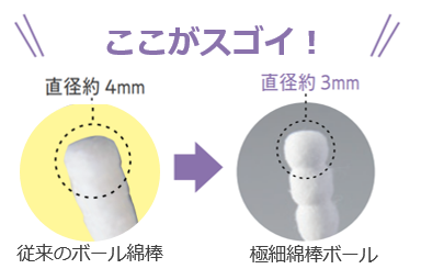 従来品のボール綿棒の直径は約4mmに対し、本商品は直径約3mmの細さを実現!