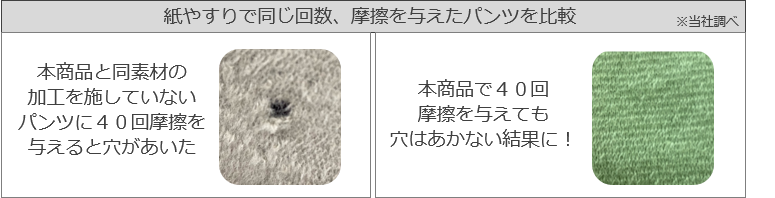 膝やおしりの擦れやすい部分も穴があきにくく、長持ちする摩擦に強い丈夫なパンツを実現!