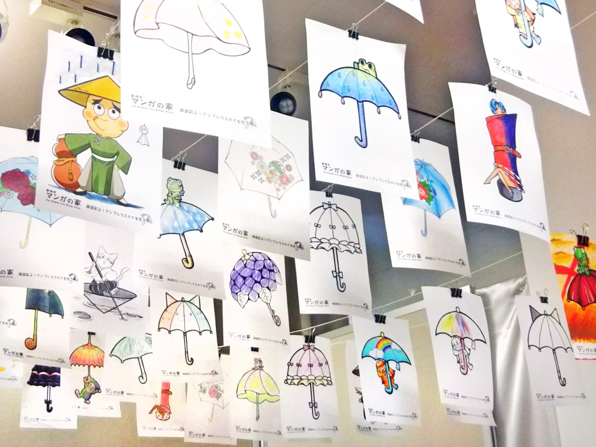 ポルトガルのアゲタで夏に開催される芸術祭のイベント「アンブレラスカイ」。空に色とりどりの傘を吊るして作るこのイベントを、新潟市マンガの家ではイラストを使って再現!素敵な「傘」を作って、ドンヨリとした梅雨の空をカラフルに彩りましょう!