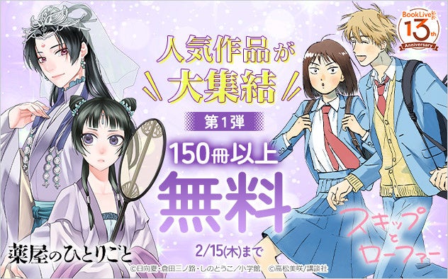 『スキップとローファー』『薬屋のひとりごと~猫猫の後宮謎解き手帳~』など、ブックライブの上位人気マンガ作品が大集結!期間中、150冊以上が無料でお楽しみいただけます。