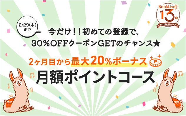 期間中に、毎月定額でブックライブポイントをお得に購入出来る「月額ポイントコース」に初めて登録してくださった方の中から、抽選で130名様に3冊まで使用できる30%OFFクーポンをプレゼントします。