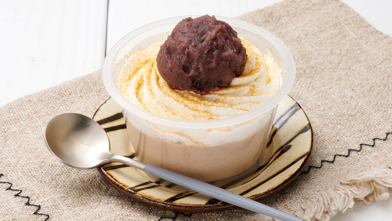 焦がしきなこを使用したぷるんと食感のきなこプリンに、ホイップクリームとつぶあんをトッピングしました。