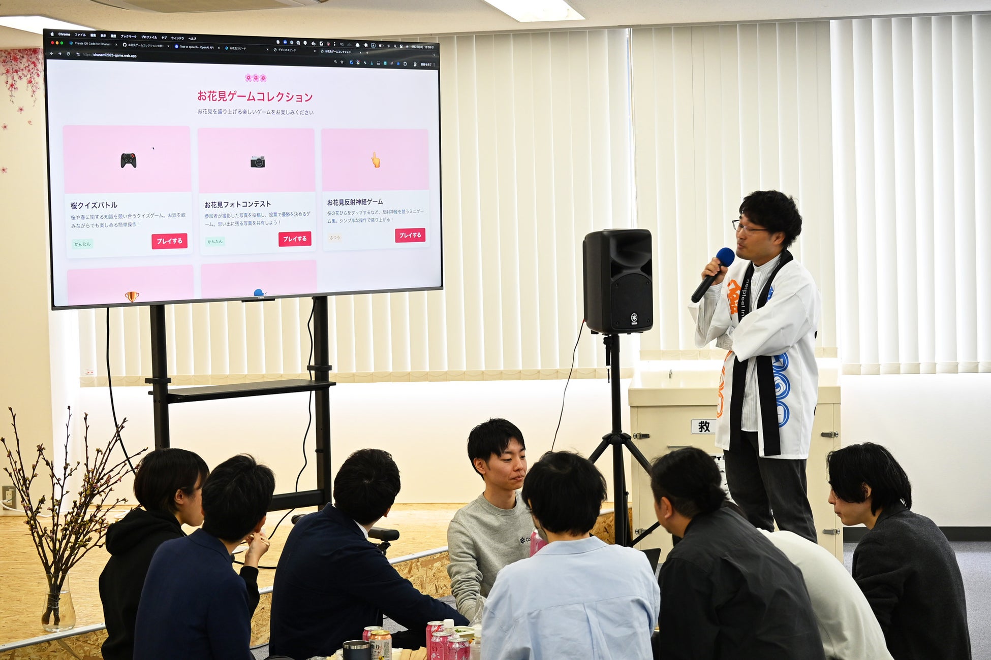 料理の到着後はDevinの音頭に合わせて乾杯をし、事前にAIが準備した「桜クイズバトル」でゲームを楽しみました。