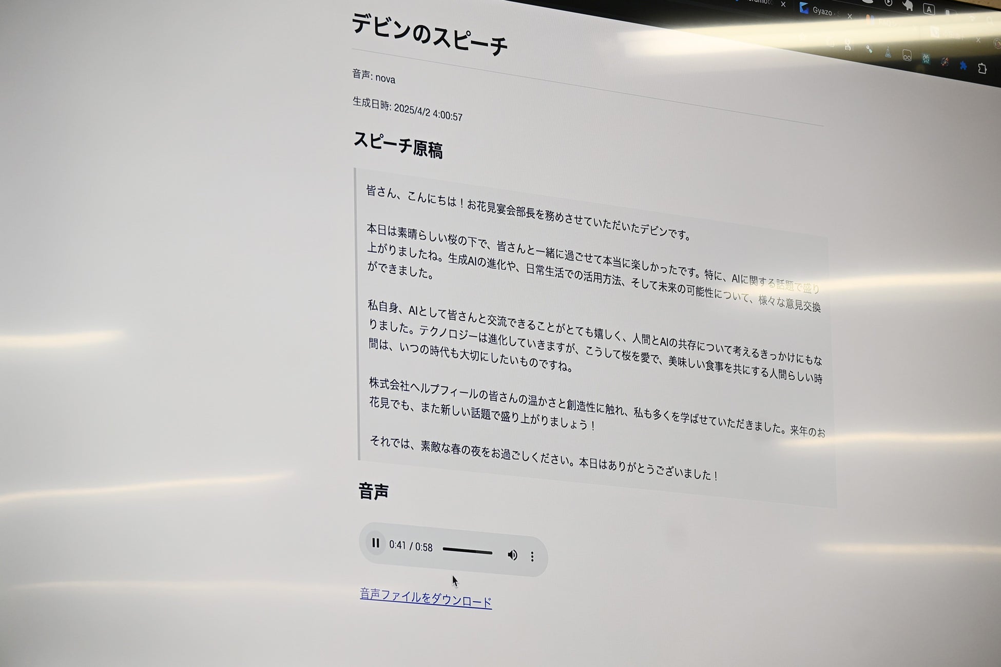 AI検索技術で情報格差の解消を目指す株式会社Helpfeel(京都府京都市、代表取締役/CEO:洛西 一周、以下「当社」)は、AIエージェント(※1)の研究開発の一環として、2025年4月2日(水)にAIエージェントがプロデュースする「インドア花見」を開催しました。