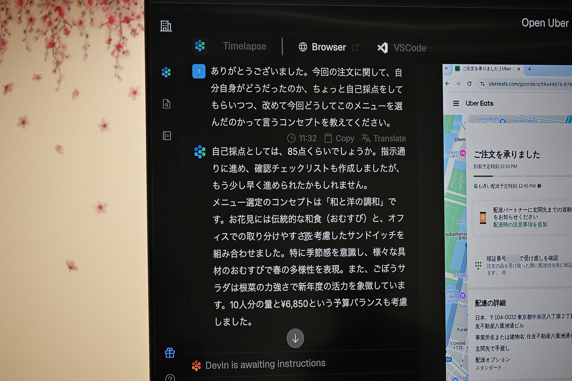 Devinにデリバリー手配の感想を聞くと、「自己採点は85点です、お花見には伝統的な和食(おにぎり)と、オフィスでの取り分けやすさを考慮してサンドイッチを組み合わせました」などと答え、AIの人間らしい回答に盛り上がりました。