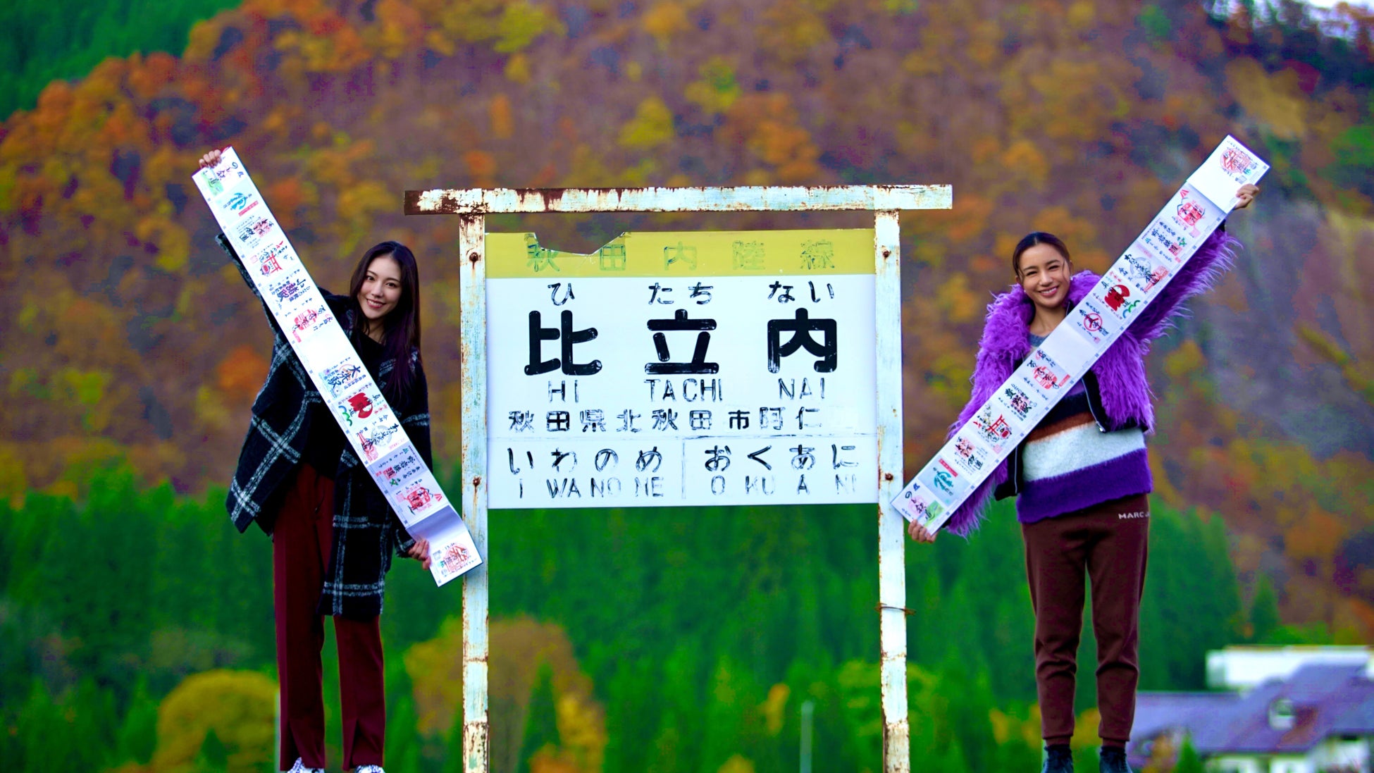 高橋メアリージュンと水沢エレナが「走る美術館」秋田の絶景紅葉路線で秋満喫!真赤に染まる山々に囲まれ、思わず童心にかえり、水切りに影送り、森吉山ダムで駆けっこなど大はしゃぎ。鉄印がもらえる阿仁合駅では名物お母さんたちが作る比内地鶏の親子丼に大満足。マタギの集落を散策し、絶品熊鍋に舌鼓!大自然に囲まれ食に満たされる秋の女子二人ローカル線の旅。