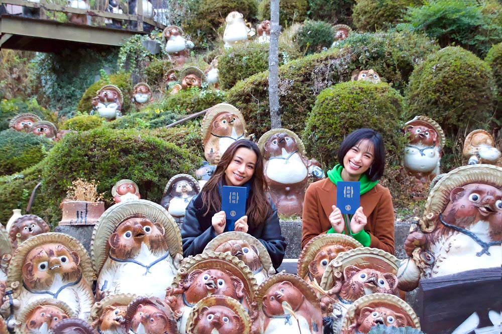 高橋メアリージュン・ユウ姉妹が鉄印求めて地元・滋賀へ里帰り、後編。前回の続きの吊り橋の先にある玉桂寺で見る巨大な大不動明王。目的地・信楽駅ではたくさんの狸の焼き物がお出迎え。