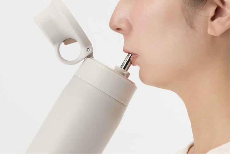 ボタンを押すとロックが解除され、そのままループを指で支えてふたを開ける仕組みになっていて、事務仕事をする際やアウトドアのときでもらくに水分補給がおこなえます。