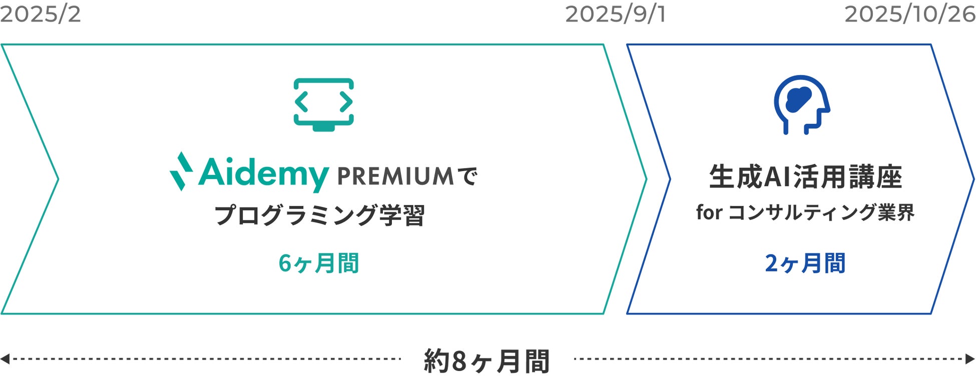 2025年9月1日(月)〜2025年10月26日(日) の8週間で「生成AI活用講座 for コンサルティング業界」を受講ください。