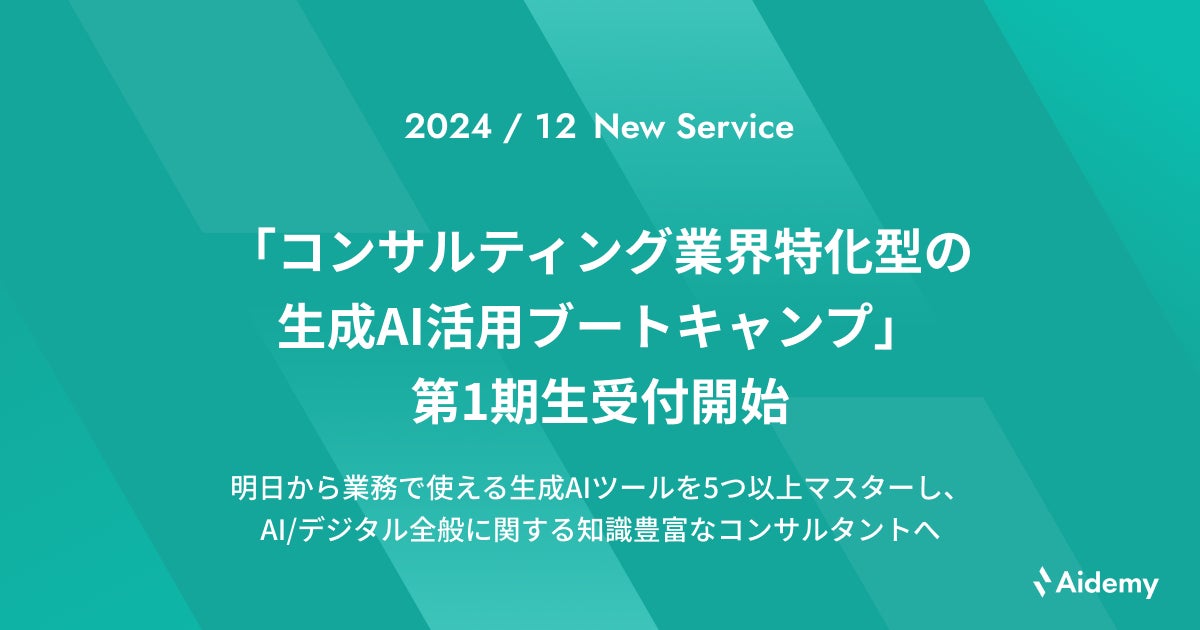 デジタル変革に伴走する株式会社アイデミー(本社:東京都千代田区、代表取締役 執行役員 社長 石川聡彦、以下「アイデミー」)は、学習プログラム「コンサルティング業界特化型の生成AI活用ブートキャンプ」を新規開講いたします。本プログラムでは、すぐに業務で活かせる生成AIツールを5つ以上(※1)マスターし、AI/デジタル全般に関する知識豊富なコンサルタントになることを目指します。
