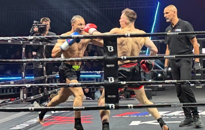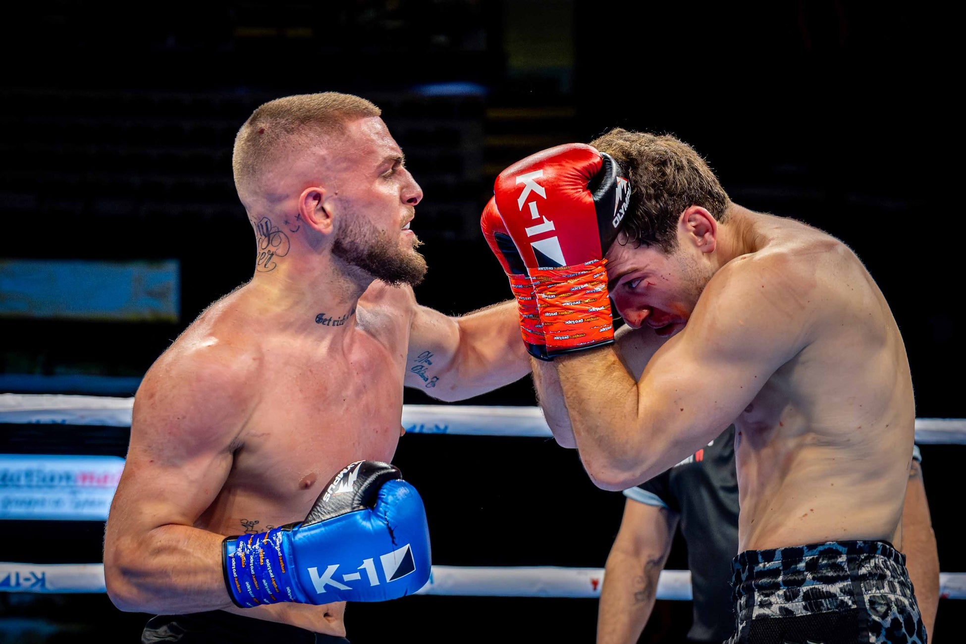 1R、カラピぺリスはプレスをかけつつ前蹴りとカーフキックで攻撃。ミハルツォスは押し返してのワンツーとパンチで勝負をかける。カラピぺリスもワンツーで打ち合いに。そして飛びヒザ蹴りを仕掛けた。打ち合いになり、カラピぺリスは左フックを顔面へ。ミハルツォスはワンツーも、ヒザ蹴りを合わせられる。カラピぺリスのヒザ蹴りがローブローとなり、会場からブーイング。中断後に再開。