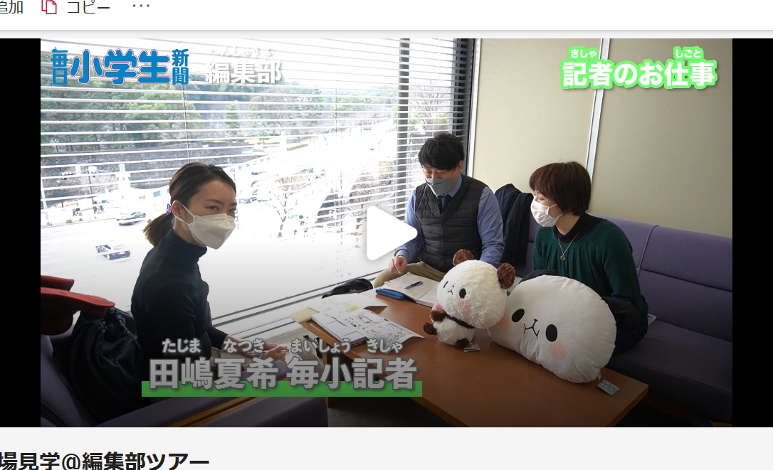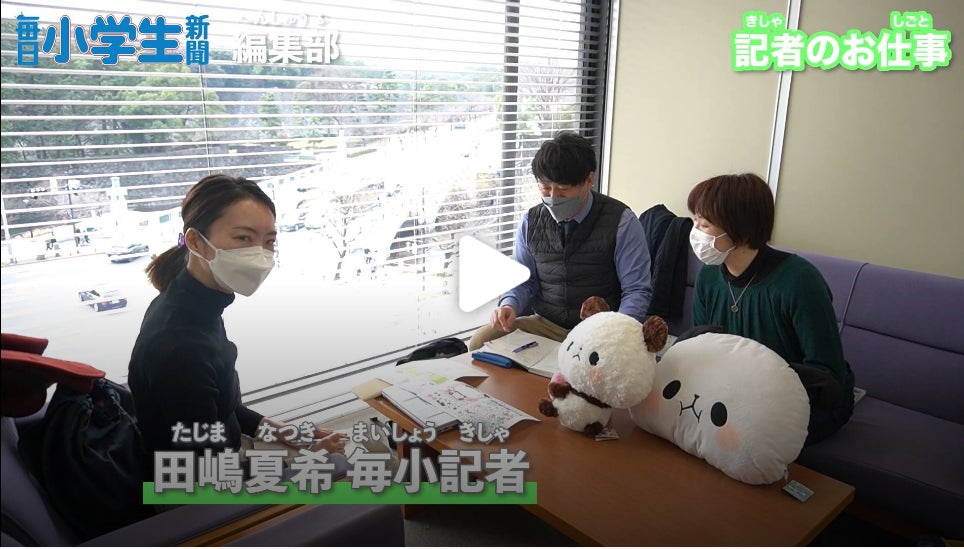 まずは、毎小の木村葉子編集長が毎日新聞東京本社にある毎小編集部から、取材やレイアウト、校閲(書き間違えなどを正す仕事)といったさまざまな役割をご紹介。取材や打ち合わせの場面もお見せします!