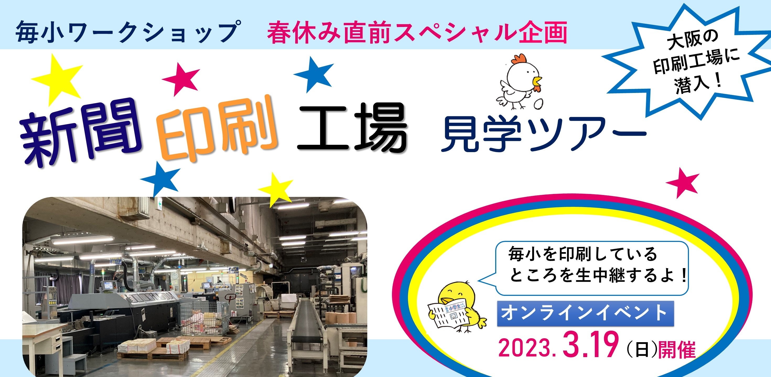 毎⽇新聞社(代表取締役社⻑:松木健)は3⽉19⽇午前10時半から、⼩学⽣の親⼦向けのオンラインイベント「新聞印刷⼯場⾒学ツアー」を開催します。毎⽇⼩学⽣新聞(毎⼩)の編集部での記事作成や⼯場での印刷といった新聞づくりのプロセスを丸ごとオンラインでお届け。お子さまの学びにつながる内容です。ぜひご参加ください。