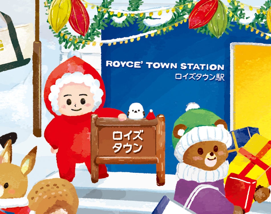 北海道・当別町に2022年3月に開業した「ロイズタウン駅」と新しいチョコレート工場の辺りはカカオやカラフルな飾りで彩られ、列車に乗ってやってきたクリスマスを楽しむ仲間たちで大賑わい。チョコレートやパンのいい香りと、みんなのキラキラ輝く笑顔に誘われて、サンタさんも遊びにきました。