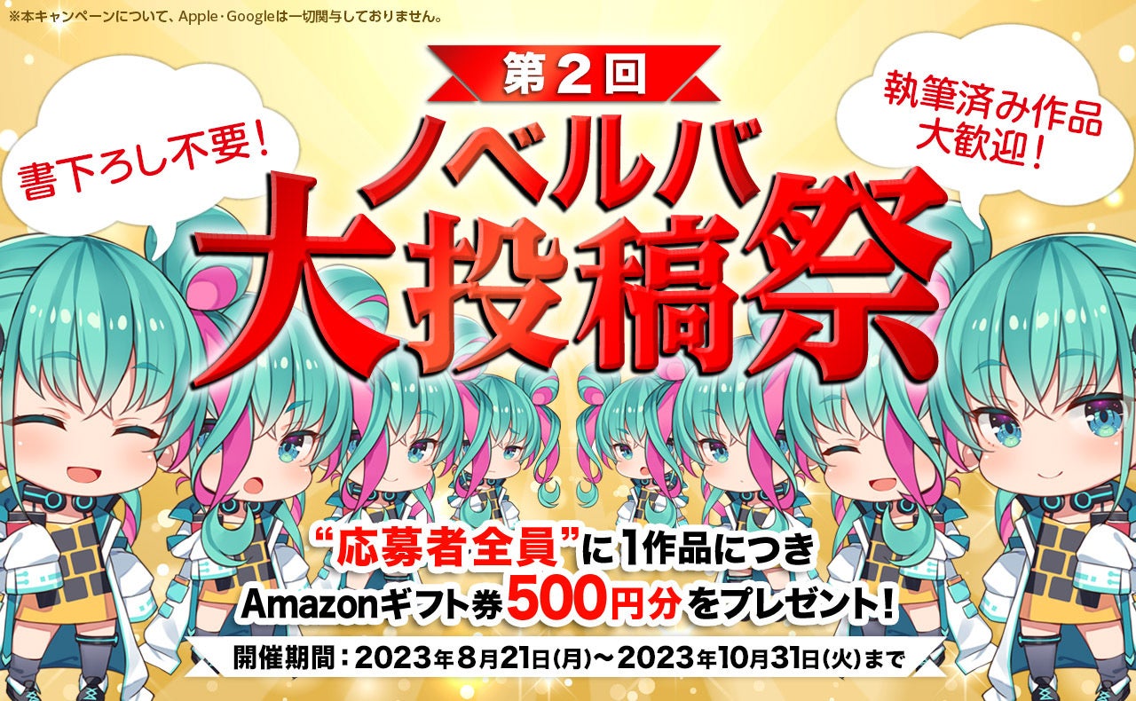 このたび、2023年4月に開催した「ノベルバ大投稿祭2023」が多くのご好評をいただきましたので、第2回の開催を決定いたしました。本キャンペーンでは、『ノベルバ』に作品をご投稿・ご応募いただいた方全員に、1作品につきAmazonギフト券500円をプレゼントいたします。さらに、「ノベルバ賞」としてノベルバ運営チームに作品が選ばれた方には、Amazonギフト券10,000円分をプレゼントいたします。皆様のご投稿・ご応募をお待ちしております!