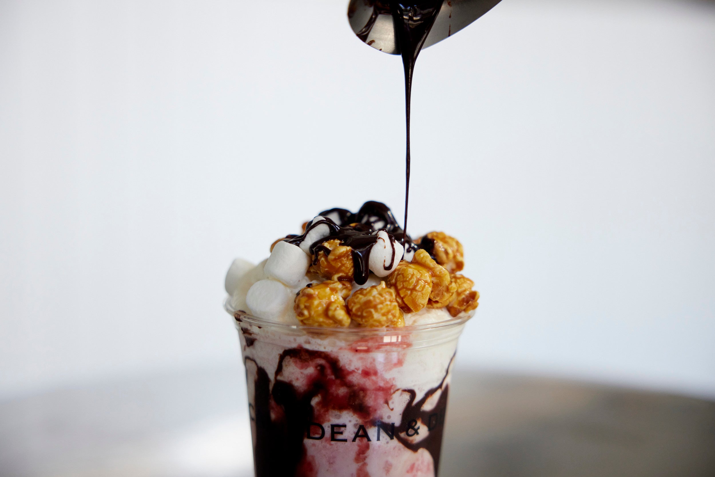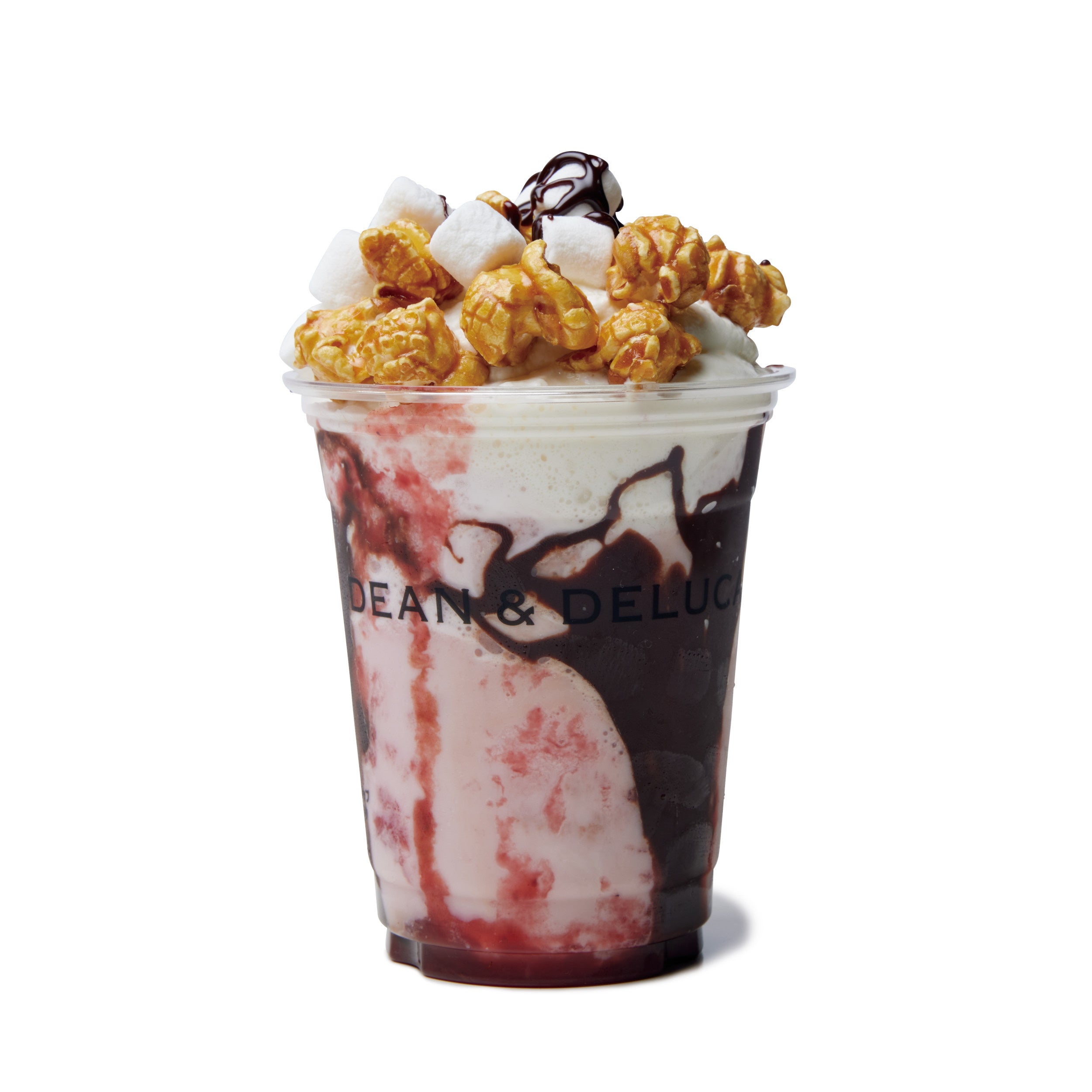 見た目からウキウキするような、スペシャルドリンクです。ベースには、夏のシーズナルドリンクとしてご好評いただいた「ストロベリーミルクフラッペ」を採用。濃厚ないちごペーストに練乳、氷を加えてクラッシュし、飲みやすい甘さに仕上げています。そこへ、チョコレートソース、いちごソース、ホイップクリーム、キャラメルポップコーン、マシュマロをトッピングしました。