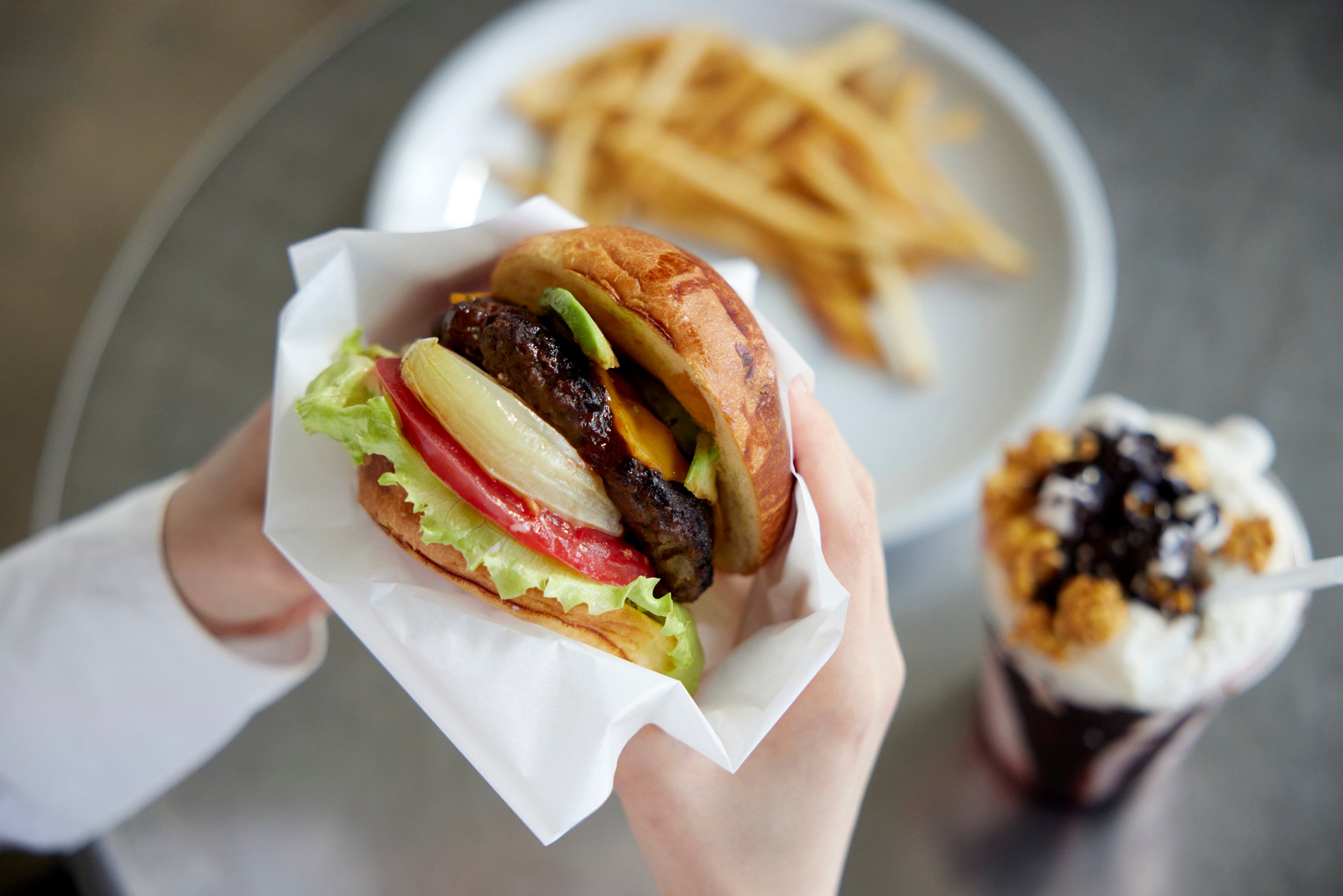 表示価格は、消費税8%を含んだ税込価格となります(イートインのご利用の場合、10%の消費税を頂戴いたします)。「100%ビーフハンバーガー アボカド&チェダー」はイートイン限定商品のため、消費税10%を含む税込価格です。