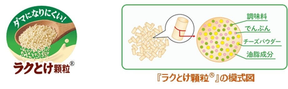 本品にとろみがつくのは「でんぷん」の働きによるものですが、一方で「でんぷん」同士がくっ付くとダマの原因になってしまいます。『ラクとけ顆粒®』は油脂成分の中に他の原材料を閉じこめているので、お湯の中に入れたときに「でんぷん」がスムーズに溶け出してダマになりにくく、なめらかなとろみを作ることができます。1995年から、「シチューミクス」をはじめとする各種製品にてこの顆粒技術を採用しています。