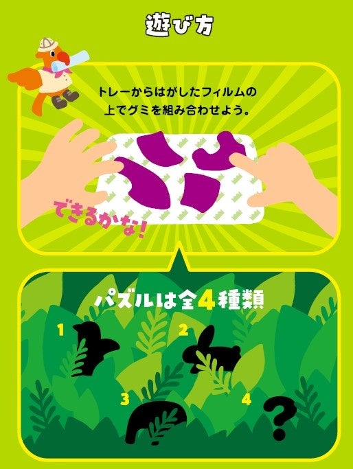 今回発売する「あそぼん!グミパズル グレープ味」は、国産果汁を使用した、お子さまも食べやすい果実感のあるグレープ味で、トレーからはがしたフィルムの上でパーツとなるグミを組み合わせると大きな動物ができあがる「アドベンチャーグミパズル」です。動物はゾウ、ウサギ、ペンギン、シークレットの全4種。好奇心や五感を刺激し、楽しみながら食べられるため、いつものおやつ時間が親子のコミュニケーションの場になります。