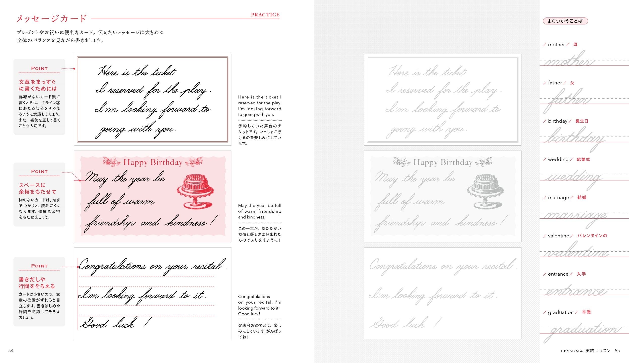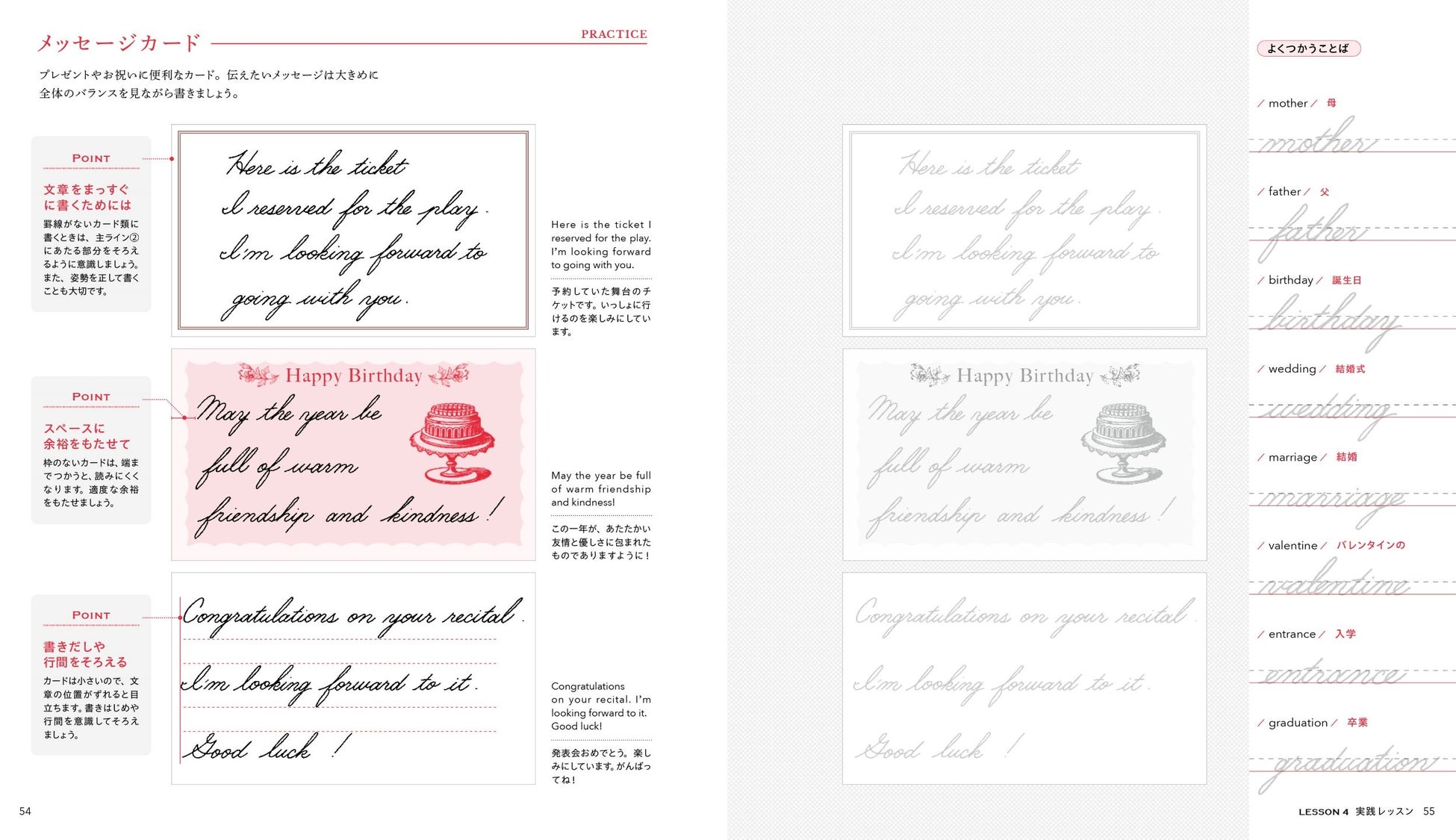 実践編ではカードや手紙など、実際に筆記体を用いるシーンを想定して、そのまま使えるお手本がたくさん。季節や誕生日、クリスマスなどのイベント、日記や手紙の書きだしなどよくつかわれる実践的なフレーズをばかり。