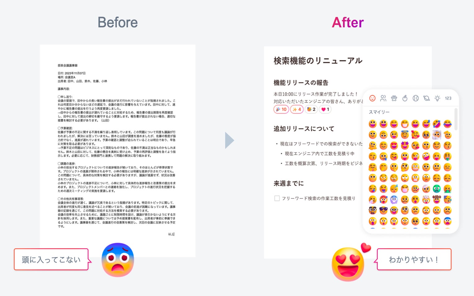 ・議事録にポップなリアクションで反応することができ、これまでの会議で意思表明がしづらかった環境を変えることができました。この環境変化により、会議への参加意欲の高まりを産むことができ、様々なメンバーから意見が上がってくるようになりました。