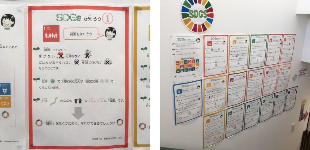 また綱島園では、「貧困ってなに?」「世界で7億人以上が1日200円で暮らしています」などと、子どもたちがSDGsの目標や世界の課題に興味を持てるようなポスターを作成しました。廊下に貼り出すことで保護者様にも関心を持っていただいています。