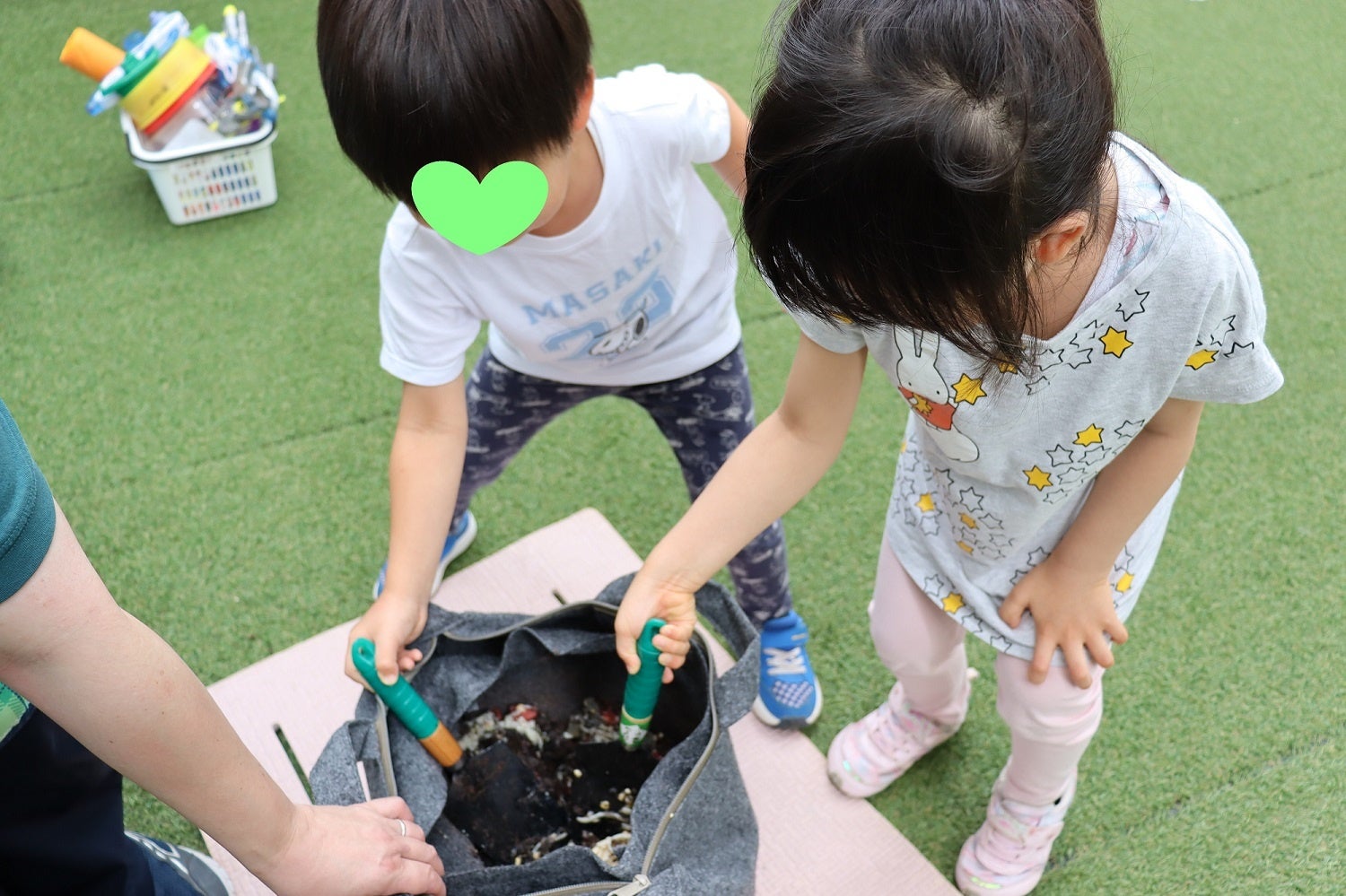 明日葉保育園各園で、給食の残菜を活用したいという想いから始まった取り組み。子どもたちは毎日、給食室から残菜を受け取り、コンポスト容器に入れてシャベルで混ぜます。出来上がったたい肥を園での野菜の栽培に活用することで、資源の循環を体験し、子どもたちの食育にもつながっています。