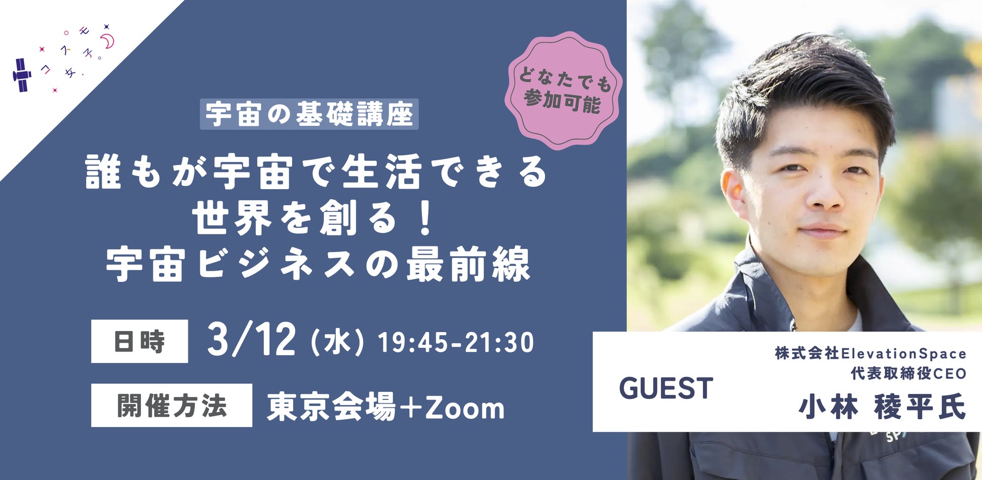 株式会社Kanatta(東京都目黒区、代表取締役社長:井口恵)が運営する「コスモ女子」は、3月12日(水)にElevationSpace CEOの小林稜平氏をお迎えしてイベントを開催します。